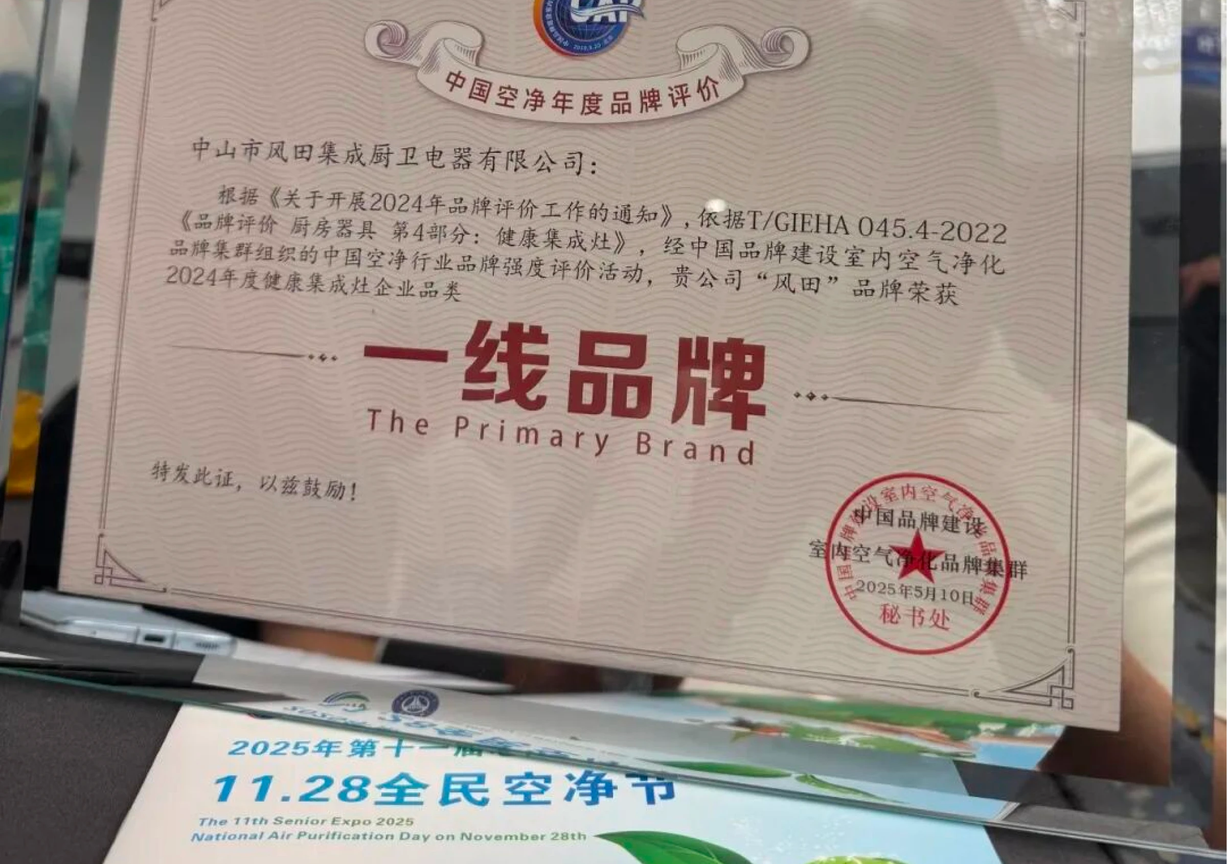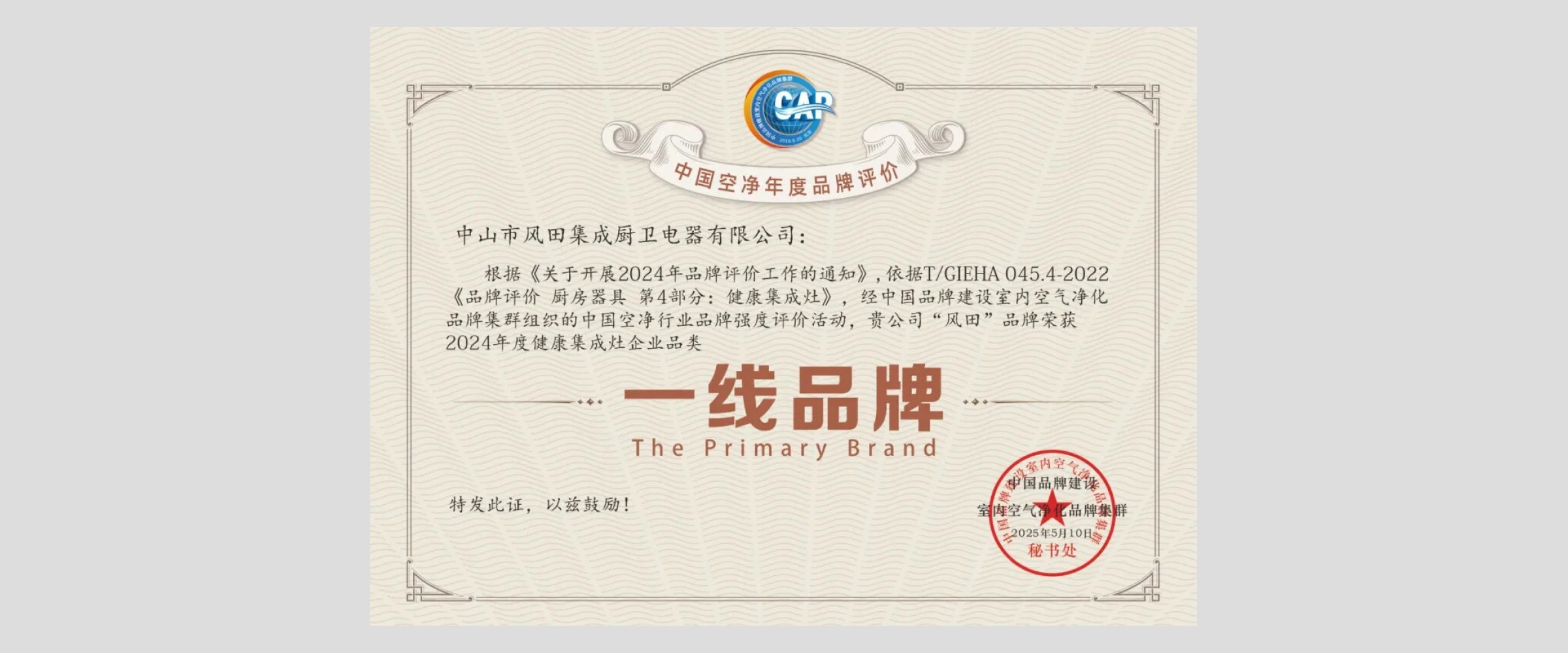Fengtian — officially Zhongshan Fengtian Integrated Kitchen & Bathroom Appliance Co., Ltd. — stood out among the nominated companies and was awarded the "2024 Healthy Integrated Cooker Tier-1 Brand" designation. Fengtian's Sales Director, Mr. Hao Lihua, attended the ceremony on behalf of the company to accept the honor.